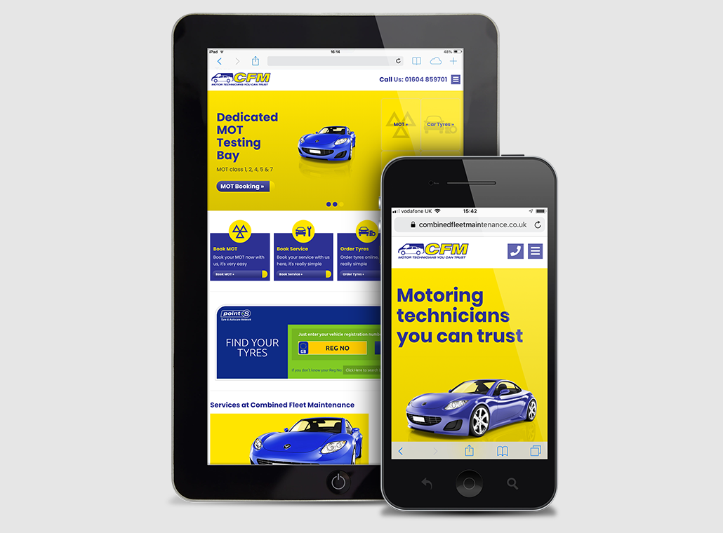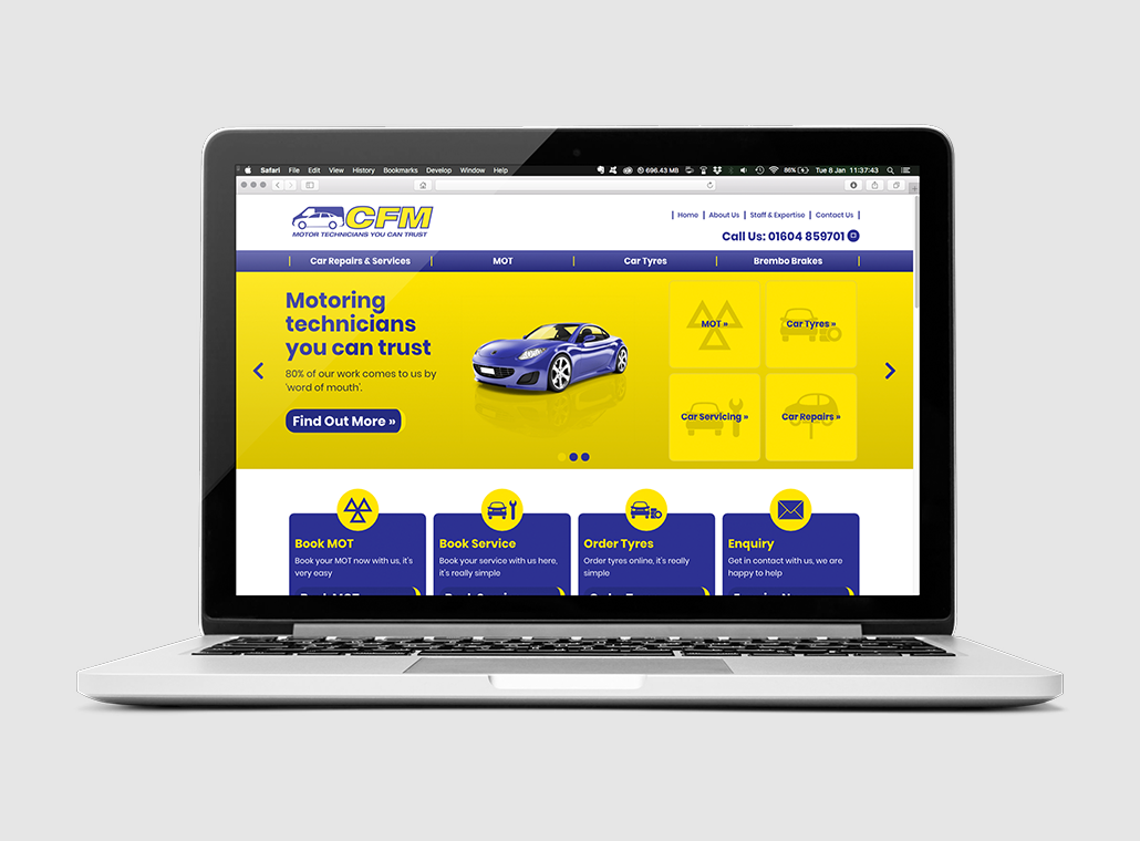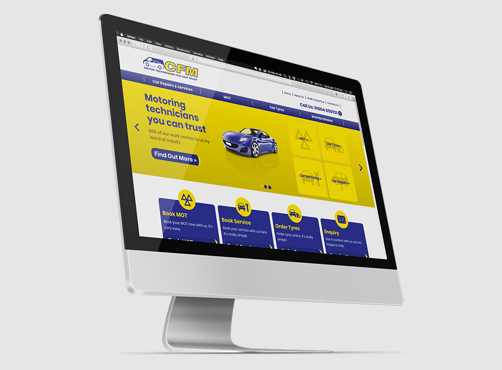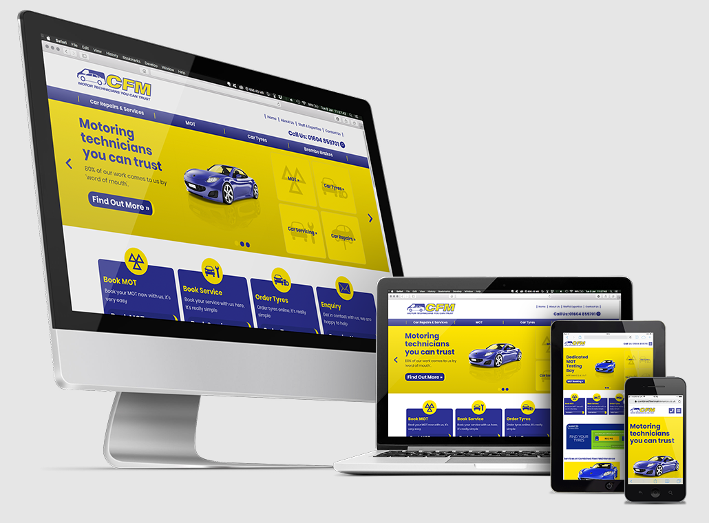 ClientCombined Fleet MaintenanceLocationNorthamptonLaunched25.06.2019The ChallengeCFM were interested in a specific tool for customers to use which simplified booking tyre replacements, along with an integrated Facebook feed which kept website visitors up to date with the firm’s social media output. The garage also wanted us to emphasise an area of key specialism – their work with Brembo brakes.The SolutionWe placed, on the main page of the website, a tool for visitors to look up and arrange for tyre fittings with one click. By adding a live feed of Facebook posts we met another request, while special prominence was given to the garage’s expertise with Brembo brakes by advertising it on the main header.